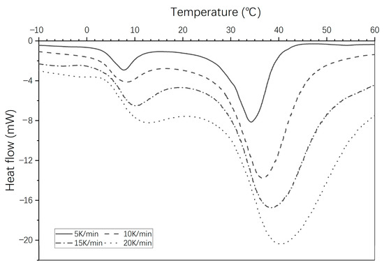 Figure 5 illustrates the DSC heat fluxes at various scan rates during the heating process. The results reveal the correlation between the DSC signal and the heating rate. It is observed that higher heating rates result in more significant heat flux. Additionally, it is found that as the heating rate increases, the peak curve shifts towards higher temperatures.