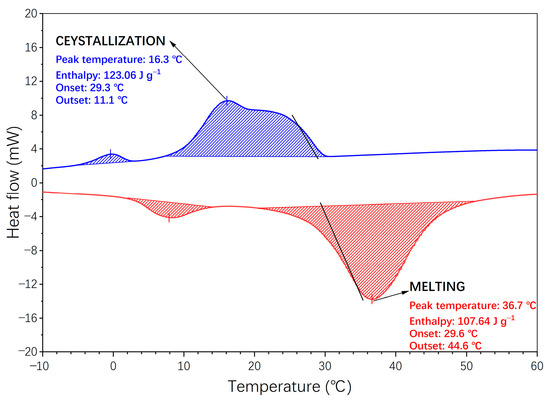 Figure 6 shows the heat flow diagram during the heating/cooling process. The DSC histograms show that the onset of melting and crystallization in mPCM particles occurs at 29.6 °C and 29.3 °C, respectively. Furthermore, it is found that the latent heat of melting and crystallization is 10.64 and 123.06 J g−1, respectively. The results demonstrate that the melting and crystallization transition of mPCM particles occurs over a broad temperature range, spanning from 14 °C to 44 °C. This phenomenon is related to the phenomenon of subcooling, which tends to zero when the heating/cooling rate is sufficiently low to allow the establishment of thermodynamic equilibrium within the sample, and, as illustrated in Figure 5, the DSC results using lower heating rates are closer to the properties of the material itself. In practical applications, it is important to consider the end water supply system for radiant floor heating to prevent hysteresis due to too rapid heating. Moreover, two peaks can be distinguished in both the melting and crystallization transition curves: the smaller peak reflects the mPCM polymer resin shell transition [42], and the other peak corresponds to the phase transition of the paraffin.