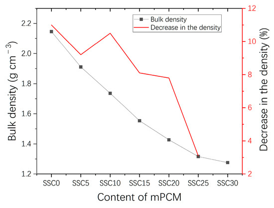 Bulk density calculations were performed using different PCM mortar samples after 28 days of curing. Figure 8 illustrates that as the mass of the mPCM replacing the fine aggregates increases, the bulk density of the mortar reduces sharply. It is observed that when the mass of the mPCM ranges from 0% to 20%, the reduction curve is linear. Within this linear region, a 5 wt% increase in the mass of the mPCM reduces the bulk density of the mortar by 9.4%. At a higher mass of the mPCM, however, the decrease rate is smaller. It is important to note that at the mixing stage, when the mass of the mPCM exceeds 25%, the volume of the mPCM has exceeded the volume of the cemented sand. This variation in density can be attributed to a variety of factors [67,68]: