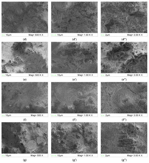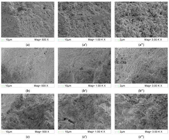 SEM images of the microstructure of different PCM mortars at various magnifications: (a–a″) SSC0; (b–b″) SSC5; (c–c″) SSC10; (d–d″) SSC15; (e–e″) SSC20; (f–f″) SSC25; and (g–g″) SSC30.