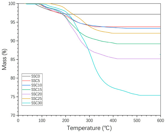 Figure 10 exhibits the TG curves under a heating rate of 10 °C min−1. The curve for the SSC0 reference mortar reveals three distinct events: The first minor weight loss phase occurs in the temperature range from room temperature to 95 °C, resulting from the evaporation loss of free and bound water. The second phase of weight loss is observed between 95 °C and 190 °C, which is caused by the loss of water bound to calcium silicate hydrate (CSH) [41]. The third and smallest mass loss occurs in the range of 400 °C to 600 °C, demonstrating the good heat resistance of the slag silicate cement.
