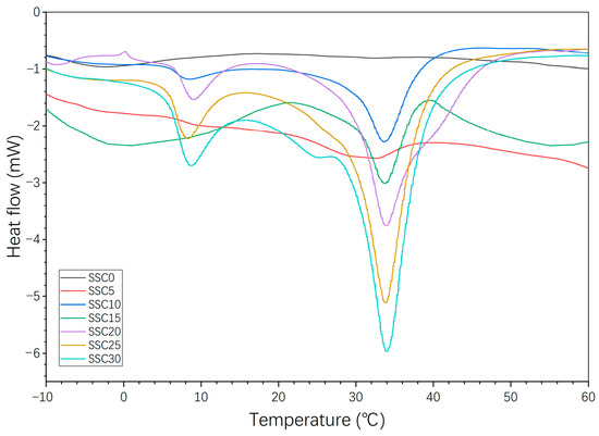 Figure 11 shows DSC heat flow diagrams obtained for different PCM mortars during the heating step at a heating rate of 10 °C min−1. It is observed that the SSC0 reference mortar reaches a stable heat flow of 1 mW. Under this condition, the mPCM particle content increases, more heating is required, the peak value of the curve increases, and the thermal characteristics of the PCM mortar change significantly. In real-world engineering applications, adding a larger mass of mPCM particles means that the floor absorbs and stores more heat during the heating process and this stored heat continues to be released for a longer period of time after the heating stops. This facilitates the utilization of peak and valley tariffs and is in line with the reality of the imbalance between the supply and demand of energy sources such as solar energy.