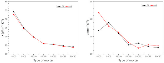 Figure 12 shows the distribution of the thermal conductivity (λ) and thermal diffusivity (α) in various PCM mortars, indicating that the thermal conductivity ranges from 0.4 to 2.4 W m−1 K−1 and the thermal diffusivity varies from 0.2 to 1.2 mm2 s−1 in various types of PCM mortars. It also shows a significant decrease in thermal conductivity and thermal diffusivity after adding mPCM particles to the mortar. It is found that the use of mPCM particles to replace fine aggregates at 0–15 wt.% significantly reduces the thermal conductivity and thermal diffusivity of the material. When the content of the mPCM particles exceeds 20 wt.%, the reduction rate decreases. More specifically, the thermal conductivity and thermal diffusivity of the SSC30 mortar with a mass of mPCM particles of 17.31 wt.% decreases by 59% and 69%, respectively. The results confirm that the presence of mPCM particles in the SSC0 reference mortar significantly affects its thermophysical characteristics, including its thermal conductivity and thermal diffusivity.