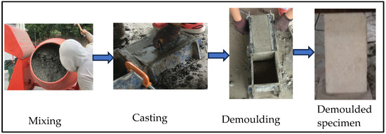 Each concrete specimen consists of a dimension of 150 mm × 150 mm with a height of 300 mm. All the tested specimens were reinforced using four 12 mm longitudinal mild steel bars with a spacing of 150 mm, which were tied using six 6 mm tie bars, consisting of a spacing of 100 mm. Due to usage of normal grade concrete, the mould thickness was limited to 5 mm to confine the specimen. According to the mix design, all of the materials and water for the concrete were combined by hand. Slump testing was used to determine the concrete’s workability which was tested as 45 mm. Afterward, the mould was filled with the mixture and compacted in two layers with a 10 mm diameter steel rod. This manual casting process was selected because of the small-scale investigation. All the specimens were demoulded after 24 h and were water cured for 28 days, as is common practice in concrete casting procedures. The preparation of specimens is shown in Figure 2.