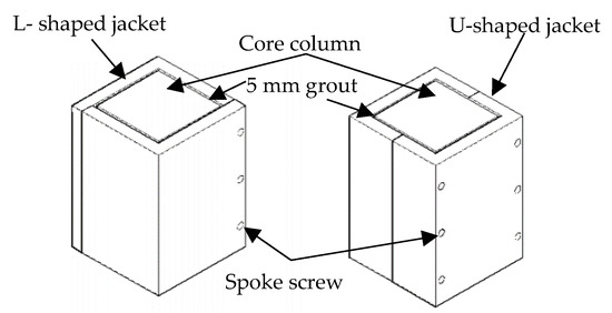 Constructing PFJ consists of cement, sand, and water, with a sand–cement ratio of 1:1. Two types of PFJ were made for this experiment, (i) L-shape and (ii) U-shape, with a thickness of 25 mm and a height of 296 mm. There is a difference of 2 mm on top and bottom in terms of the height of the square concrete stub columns. As a result, during the compression test, the load will be applied to the column specimens, and then transferred to the precast ferrocement jackets. As a reinforcement for the ferrocement panels, 2 layers throughout the length and 1 extra layer at the corners of the woven galvanised wire mesh, as discussed in Section 2.1, have been used so that concrete can sieve through and create a strong bonding with the mesh. One extra layer of wire mesh was placed at the corners to prevent the corner from premature corner cracking [3,4,31]. To keep the jointing mechanism simple, bicycle spokes were used to join two parts of ferrocement jacket panels. The spokes were connected with the wire mesh at a distance of 100 mm from the centre and 50 mm from the top and bottom of the specimens. In the L-shaped jacket, 3 spokes were installed on one leg, and 3 horizontal holes through the local longitudinal axis were kept in the other leg to receive 3 spokes from another jacket. The spokes and receiving holes were parallel to each other. On the other hand, in the U-shaped jacket, three spokes were installed on one leg, and three holes through the thickness of jacket were kept in the other leg.