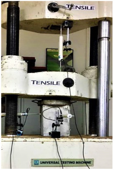 In order to carry out the test, a Universal Testing Machine with a capacity of 1000 kN was utilised. The manufacturer of the machine is “TENSILE”, having an accuracy of ±0.5% of reading down to 1/500 of load cell capacity. The test specimens were placed in the compression space and locked using manual clamping. Linear Variable Displacement Transducers (LVDT) were utilised to obtain accurate readings of both the axial and lateral deflections of each specimen, as can be seen in Figure 5. The test specimen was tested through progressively increasing concentric load of 1 kN/s applied from above until it finally failed. The load was applied concentrically to both the control sample and the specimens that were strengthened using a jacket. In order to evaluate the increase in compressive strength, axial deflection, and lateral deflection, as well as the effectiveness of precast ferrocement jackets for damaged and undamaged RC columns, test specimens and a control sample were compared [32].