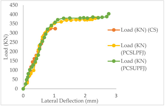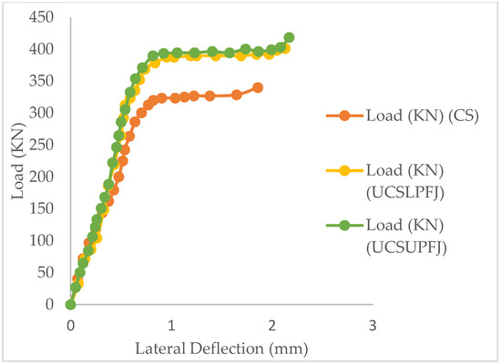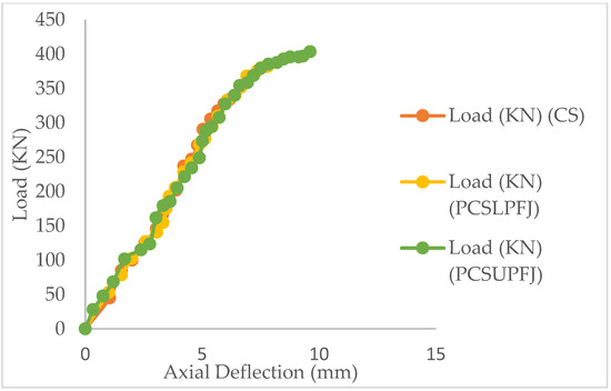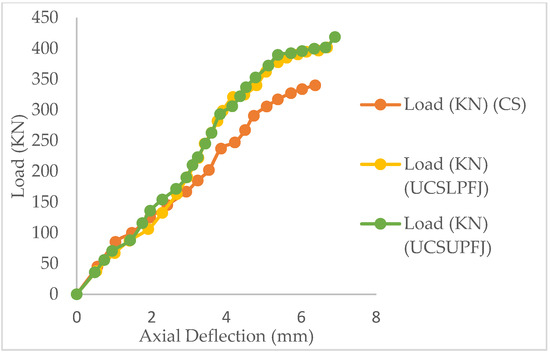 Table 3 reveals that the axial load carrying capacity of all jacketed specimens is greater than that of the control specimens without jackets. Moreover, cracked specimens demonstrated a higher yield capacity than the control specimen, which may be due to the effect of cracks on the column, which prolonged the yield capacity but weakened it in terms of ultimate load [33], despite the fact that the column’s load-bearing capacity has improved over the original column. On the other hand, cracked specimens indicate better yield load and load carrying capacity than any other specimens, demonstrating ferrocement’s suitability as a reinforcing material [13]. In contrast, among all the jacketed and unjacketed specimens tested, the un-cracked specimen jacketed with U-shaped PFJ has the highest load-bearing capacity, 418.7 kN, an increase of 23 percent over the control specimen. It can also be observed that strengthened column specimens recorded higher load-bearing capacities than repaired column specimens, despite the fact that both types of specimens contain identical wire mesh layers. In both cracked and un-cracked specimens, U-shape PFJ has resulted in the highest load-bearing capacity, with an increment of 19% and 23%, respectively, which proves that the U-shape prefabricated jacketing method has the highest load-bearing capacity [3,11]. However, all the specimens had a tremendous increment in ultimate load ranging from 13 to 23%, which clearly indicates that PFJ is more effective and beneficial than non-jacketed specimens.
