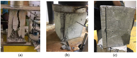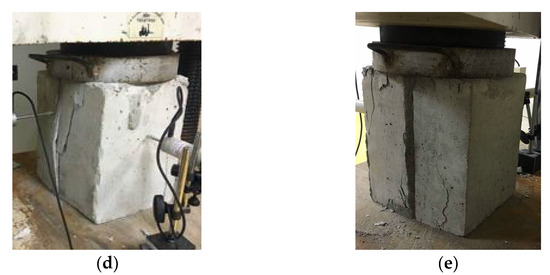 In Figure 10, samples of specimens following laboratory testing under the concentric loading mode are illustrated. At the point where the force is applied, the column specimens that are not jacketed start to fail due to concrete cracking. This can be seen in Figure 10a. All of the specimens of the jacketed columns, on the other hand, start to fail at the joints of the prefabricated ferrocement jackets, particularly in the centre of the faces and corners of the specimens [35]. Due to the accumulation of stress at the corners, corner cracks can be seen in L-type jacketed specimens that have been evaluated using the concentric mode of loading (see Figure 10b,c). The arching effect of strains at the corners (a point of stress concentration) could be to blame for this [36,37]. The corners of a U-type jacketed specimen are reinforced with additional wire mesh, which causes cracks to appear in the middle of each of the faces of the specimen (Figure 10d,e). The pattern of failure indicates that all the jacketed specimens are prone to failure on the joint area of the PFJ. The prefabricated jackets were jointed using steel spokes that could not provide an ample amount of shear strength to cater for the shear stress along the connection area. As a result, all the specimens showed cracks through the joint area. A better jointing system could provide an improved confinement system for the core specimens.