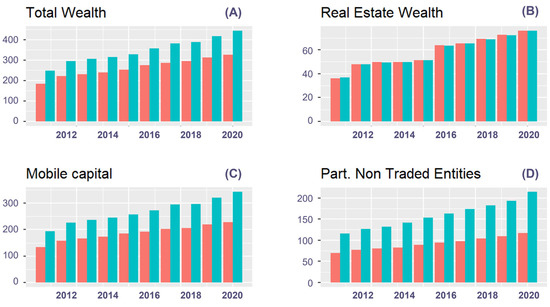 As already pointed out, the study covers 10 years (2011–2020) and is based on data from the related primary source [64]. The data of property tax filers for the year 2020 show a parity of the number of declarations by gender. Specifically, 109,152 men and 109,839 women filed, whose average assets were worth EUR 4062 and 2959 thousands, respectively. This implies that people of both sexes reach the highest levels of wealth, but it is significantly more concentrated in the hands of men, whose average wealth is 37.3% higher than that of women. During the period under review, there has been a 63.37% increase in male respondents compared to 73.24% in women. This has caused that wealth tax submissions by women in 2020 has represented as of 0.63% higher than those relating to male tax payers. In contrast, related declarations submitted by male tax payers was as of 5.38% in 2011. During the study period, however, the evolution of the number of tax returns has developed differently from the monetary amount of them, since declarations of male taxpayers increased by 9.58% over the period analyzed, while those submitted by women increased by 2.55%. Furthermore, it is important to note that total assets grew by 7% annually above average, and the value of real estate assets, insurance, and annuities presented above-average growth. By contrast, the growth of assets assigned to economic activities and movable assets remained below the average growth. According to asset classifications from Table 4, those pertaining to movable capital represent 74% of the total for the year 2020, whereas those belonging to real estate comprise 20% of the total. Among all items, shares and participations in non-traded legal entities carry the greatest weight in the weighting structure for this year, 43% of the total, to be precise. These two categories, indeed, are the most relevant in terms of all assets declared on the wealth tax return for this relevant year. By contrast, none of the other four categories represent more than 2.3% of the total. Nonetheless, as shown in Table 4, the asset classification is made up of the six main categories displayed and their subclass lists, thus making it a comprehensive approach to the asset allocation of the investment portfolios.
