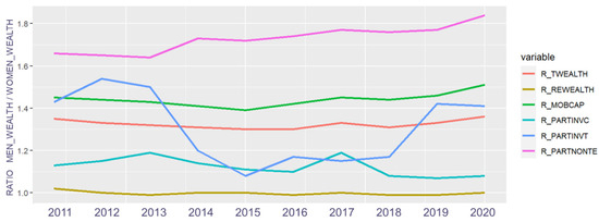The gender ratio of assets according to the following items: R_TWEALTH (total assets ratio); R_REWEALTH (real estate ratio); R_MOBCAP (total movable assets ratio); R_PARTINVC (equity in shares and collective investment shares); R_PARTINVT (equity in shares and quoted shares); R_PARTNONTE (equity in shares and unquoted shares). Source: own calculation based on data collected from the Spanish Tax Office [64].