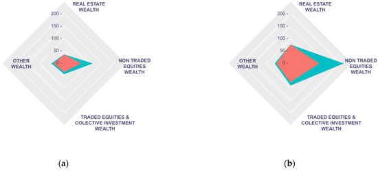 Due to all the above, the impact of financialization on the real estate sector entails a translation of the opportunities of direct investment in real estate assets to the generation of such opportunities from holding companies. Related investment decisions are significantly aligned with business profitability objectives, thus adding aspects of leverage and volatility to a traditionally more rigid market. Therefore, the present paper shows differences in investment decisions that are presumed to have been made by individuals in conditions of freedom. The fact that there are differences in the distribution of assets between men and women is the result of voluntary decisions by economic operators showing preferences for assets with different characteristics in which the profitability ratio, risk, and liquidity behave unevenly. The results also state the overview of the distribution of wealth in Spain declared by taxpayers with a total amount of related assets greater than EUR 700,000 yielded according to tax laws currently in force at any given time. In 2020, a total of 218,991 wealth tax filers declared taxable estates based on their total assets to the Spanish Tax Office. However, the share of this tax in the volume of the annual tax burden in Spain has been usually slightly above 1% over the past years. Specifically, there were 21,638,795 income tax filers in 2020. According to asset composition by wealth level for 2015 in Spain [66] (p. 46), based on data collected by the authors from the World Inequality Database, only 1% of all filers subject to wealth tax liability had 23.9% of the country’s total wealth. In addition, whereas the wealth tax is levied on the net wealth of individuals with more than EUR 700,000 worth of assets living, with unrestricted tax liability, within their national territory, as well as on non-residents, with limited tax liability, in Spain, three regional governments have so far approved some allowances for the tax, namely by 100% in both Andalusian and Madrid, and by 25% in Galicia.