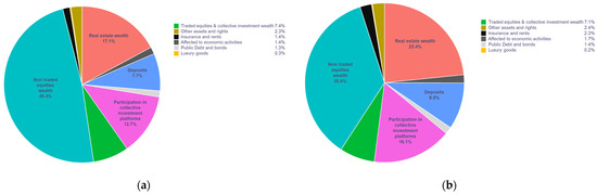 Distribution of investment portfolios by gender for the year 2020, specifically: (a) referring to male investors; (b) referring to female investors. Source: own calculation based on data from [65]. Note: for a better understanding, four main items have been labeled on their corresponding slices of the pie chart (although the total value of each graph is equal to 100%, differences can be observed due to existing decimals in subtotal of each asset category).