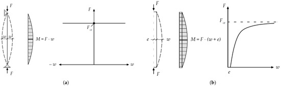 Even in a laboratory setting, it is highly unlikely that these conditions will be met perfectly, since real structures are always fraught with unavoidable imperfections, e.g., due to the manufacturing process. In fact, the existing imperfections will cause a deflection as soon as a load is applied (Figure 2b). As the bending deformation increases rapidly, so does the moment M, according to the second-order theory, until the structure collapses under the combined effect of the internal normal force and moment (deflection-amplification-type buckling). For vanishingly small imperfections, failure occurs below but close to .