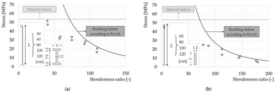 Table 7 gives an overview of the results of all of the buckling tests, thereby listing the achieved critical stress (calculated as the quotient of the experimentally determined maximum force F to the respective mean cross-sectional area A) for each specimen. For the assessment of the values, the critical stresses of an ideal Euler column with the corresponding slenderness ratio were calculated with Equation (2) and related to the experimental results.