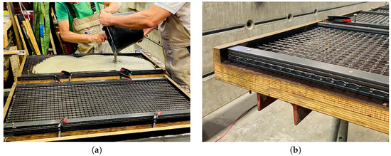 The specimens used for this study were produced at the Otto-Mohr-Laboratorium (OML) of TU Dresden. A formwork made of sealed timber (990 × 380 × 26 mm) was used to cast thin concrete slabs (Figure 4a). In order to secure the position of the reinforcement, the grid was clamped in between steel strips that were adjusted along the long edges of the formwork (Figure 4b).