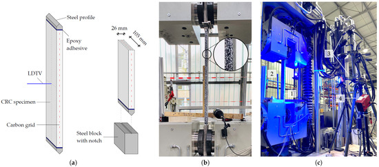 As for the reinforcement, a biaxial warp-knitted grid made of carbon fiber yarns with an epoxy resin coating was used. The axial fiber strand spacing and the yarn cross-sectional area were the same for both the warp (longitudinal) and the weft (transverse) directions, thus accounting for a symmetrical reinforcement area of 85 mm/m. The ultimate stress and modulus of elasticity were determined in uniaxial tensile tests according to [27] for ten single warp yarns that were extracted from the grid. Details about the geometrical and mechanical characteristics of the grid are listed in Table 1.