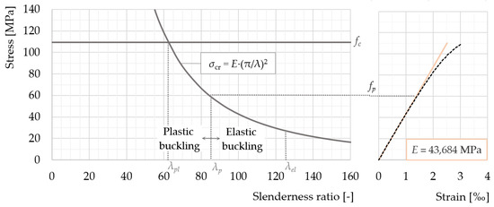 Since the actual material behavior is not taken into account in Euler’s buckling equation, the sudden transition from the material to stability failure can exclusively occur for columns made of linear elastic material. Concrete exhibits an approximate linear elastic behavior only at lower stress levels, thereby changing into nonlinear behavior with increasing stresses, which is when Equation (2) can no longer be applied. Depending on the proportionality limit of the material, the corresponding threshold value for the slenderness ratio can be determined with Equation (3):