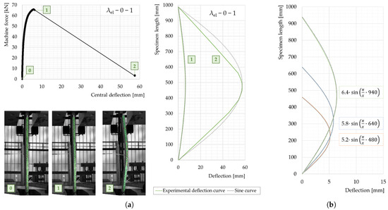 The displacements of the sample were computed from the photogrammetric images of the narrow front surface using the commercial software GOM ARAMIS. The right diagram in Figure 11a shows the bending lines (deflection at each length coordinate of the specimen) corresponding to the significant points 1 and 2 compared to a sine curve with the same maximum deflection in the middle calculated from Equation (4). For the moment when the ultimate load was reached, the experimental bending line showed very good agreement with the ideal sinusoidal shape of the deflection curve according to Euler (Section 1.2). At the end of the test, the experimental bending line deviated from the theoretical sinusoidal curve, thus showing remarkably larger curvatures in the central part of the specimen due to cracks that formed mainly in the middle third on the stretched side.