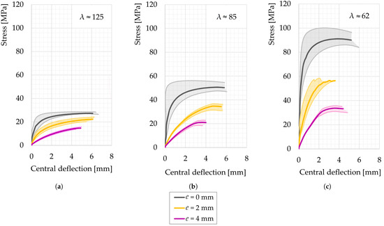 Figure 12 displays the mean stress–deflection graphs for the investigated slenderness ratios and load eccentricities surrounded by the respective scatter of the experimental curves. An unavoidable scatter resulted from the manufacturing process, since even with great effort, the actual specimen dimensions individually deviated from the planned geometry, thereby leading to small differences in the slenderness ratios. In particular, the scatter for the tests with the intended centric load application showed larger expansions, probably due to additional small deviations from the perfect load introduction that were inevitable, despite the great care that was taken when attaching the steel profiles.