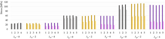 The results of the other experiments reveal a clear trend of diminishing buckling resistance with increasing load eccentricity. This effect appeared to be stronger with decreasing slenderness ratios (Figure 13). Compared to the stresses obtained with centric loading, the load-bearing capacity decreased by 15% and 50% for the series due to the load eccentricities of 2 mm and 4 mm, respectively. Furthermore, the critical load was reduced by 32% ( 2 mm) and 50% ( 4 mm) for the series , as well as by 40% ( 2 mm) and 62% ( 4 mm) for the series (average values).