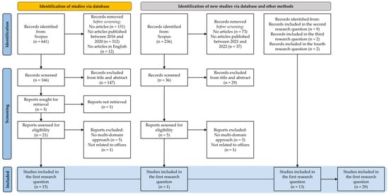 Figure 1 shows the study-selection process followed for the first research question, “How is IEQ perceived and evaluated?”. The literature search brought 641 results, lowered to 490 by applying the document typology limitation to articles. A further reduction to 166 records was applied by excluding the documents not published between 2016 and 2020 and the documents not written in English. After the screening of their title and abstract, only 21 out of 166 were considered to be relevant to the research question. Particularly, 146 were excluded because they were related to other research fields, such as the medical, psychosocial, nursing and management fields. After the full text reading, 6 records were further excluded because they did not present a multidomain approach (n = 5) and because they were not carried out in offices (n = 1). Finally, only 15 of the available studies on IEQ perception and evaluation in offices were used. Only 1 study published between 2021 and 2022 was added, and 13 studies were added from the second (n = 9), third (n = 2) and fourth (n = 2) research questions, for a total of 29 studies analyzed.