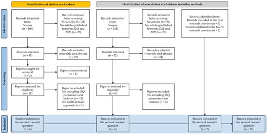 Figure 2 shows the study-selection process followed for the second research question, “What are the main IEQ indexes and parameters?”. The literature search brought 106 results, lowered to 68 by applying the document typology limitation to articles. A further reduction to 45 records was applied by excluding the documents not published between 2016 and 2020. After the screening of their title and abstract, only 19 out of 45 were considered to be relevant to the research question. After reading the full text, 13 records were further excluded because they were not related to the four IEQ domains’ parameters and indexes or because they did not present a multidomain approach. Finally, only 6 of the available studies on IEQ indexes and parameters to assess office environments were used. Additionally, 6 studies published between 2021 and 2022 were added and 7 studies from the first (n = 5) and fourth (n = 2) research questions were added, for a total of 19 studies analyzed.