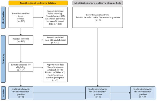 Figure 3 shows the study-selection process followed for the third research question, “What are the main contextual and personal factors that influence the comfort perception?”. The literature search brought 703 results, lowered to 371 by applying the document typology limitation to articles. A further reduction to 160 records was applied by excluding the documents not published between 2016 and 2020. After the screening of their title and abstract, only 17 out of 160 were considered to be relevant to the research question. Particularly, 143 were excluded because they were related to the medical field, chemical field or computer science field or because they did not present a multidomain approach. After reading the full text, 13 records were further excluded because they did not present a multidomain approach or were off topic. Finally, only 4 of the available studies on contextual and personal factors influencing comfort perception were used. No studies published between 2021 and 2022 were added, since the research conducted on the Scopus database did not bring significant results on the topic. In the end, 6 studies from the first research question were added, for a total of 10 studies analyzed.