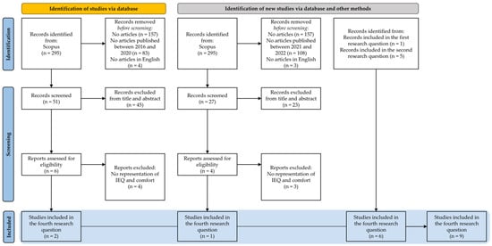 Figure 4 shows the study-selection process followed for the fourth research question, “How are IEQ and comfort represented in space and time?”. The literature search brought 295 results, lowered to 138 by applying the document typology limitation to articles. A further reduction to 51 records was applied by excluding the documents not published between 2016 and 2020 and the documents not written in English. After the screening of their title and abstract, only 6 out of 51 were considered to be relevant to the research question. Particularly, 45 were excluded because they were related to the medical field or chemical field or did not present a multidomain approach. After reading the full text, 4 records were further excluded because they were considered to be off topic. Finally, only 2 of the available studies on IEQ and comfort representation in space and time were used. Additionally, 1 study published between 2021 and 2022 was added, and 6 studies from the first (n = 1) and second (n = 5) research questions were added, for a total of 9 studies analyzed.