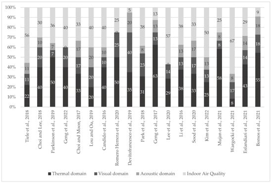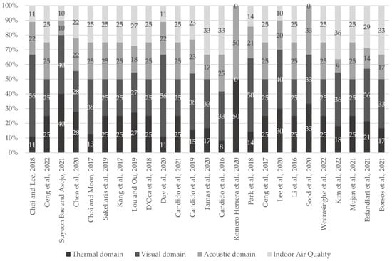Weight in percentage for thermal domain, visual domain, acoustic domain and indoor air quality over overall IEQ calculated considering the number of parameters assessed for each domain in the analyzed studies [,,,,,,,,,,,,,,,,,,].