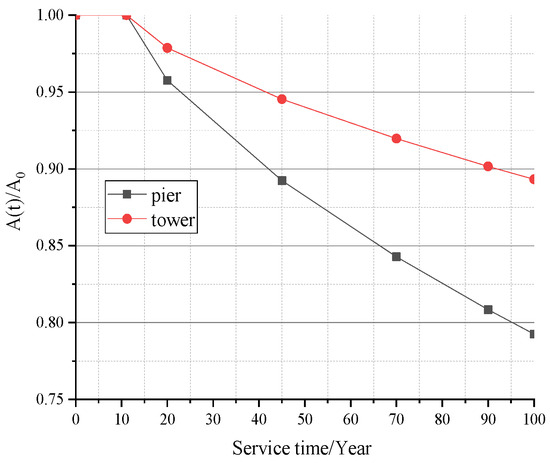 According to the previous investigation, the loss of the cross-sectional region of the reinforcement in the component with time can be represented as [27]: