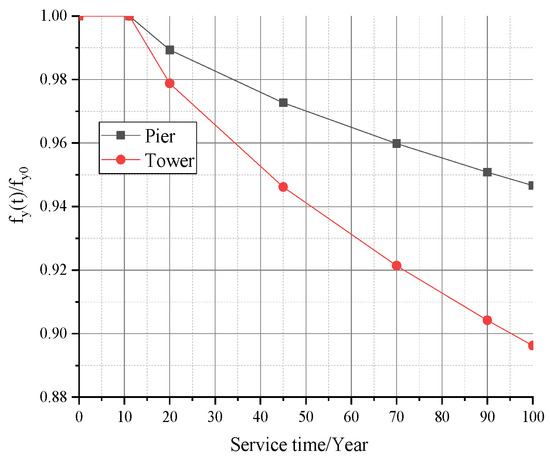 Which, f y ( t ) means the yield strength of the reinforce at the time t considering corrosion, f y , 0 represents the initial yield strength of the steel bar, and α y is the empirical coefficient. In the study of Du [29], the value is usually 0.005.