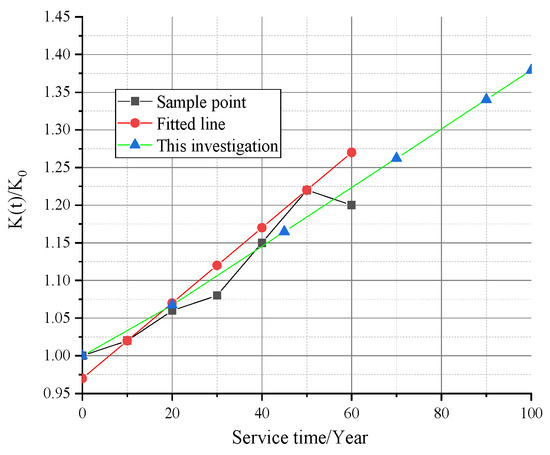 Equation (17) K represents the horizontal shear stiffness ratio of the bearing and T i is the servicing time of the rubber bearing in a corrosive environment. Equation (17) can be used to obtain the horizontal shear stiffness ratio at each service time.