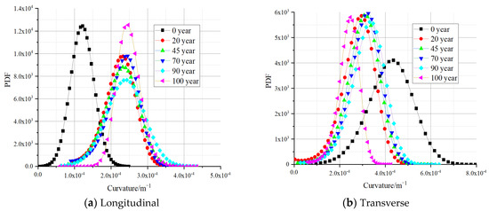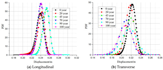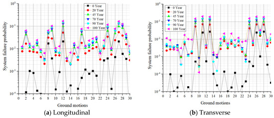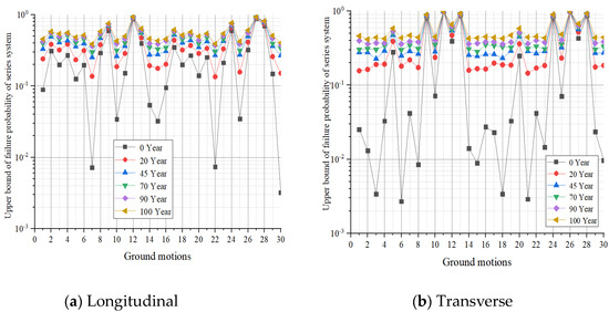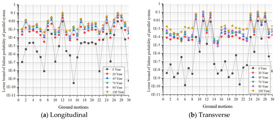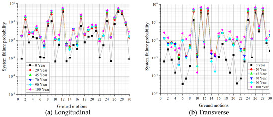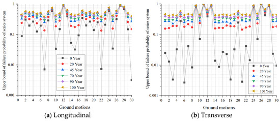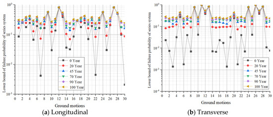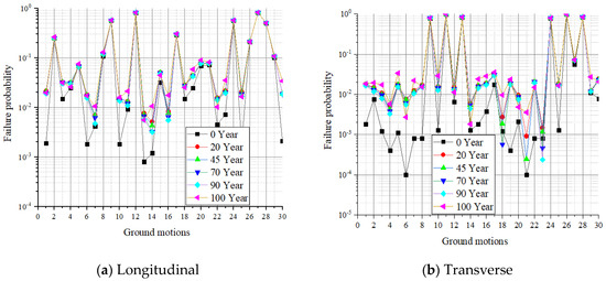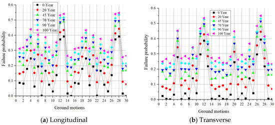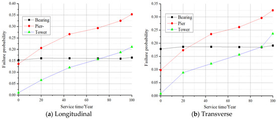 In detail, the average values of the longitudinal and transverse failure probabilities of the three components at each service time are presented in Table 10 and Table 11. For the bearing, the longitudinal and transverse failure probability follow the servicing time. The probability of longitudinal and transverse failure increases significantly while increasing the maintenance time for the bridge piers and pylons. Specifically, the mean values of the longitudinal failure probability of piers at 20 years, 45 years, 70 years, 90 years, and 100 years increased by 51.94%, 95.76%, 111.78%, 138.48%, and 156.25%, respectively, compared with the initial time of service. At 100 years of service, the transverse failure probability of bridge piers has increased by 230.85% compared to the initial time of service. For the failure probability of the tower, the influence of the corrosive environment is also very significant. The longitudinal and transverse failure possibility has increased from the initial 0.0109, 0.0083 to 0.2098, and 0.2383 after 100 years of servicing, respectively. It can be found that the corrosive environment has a significantly increasing effect on the longitudinal and transverse failure possibility of piers and towers.