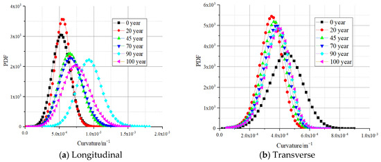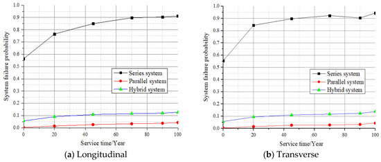 (3) Comparing and analyzing the failure possibility of the series, parallel, and hybrid systems at each servicing time in the longitudinal and transverse direction, the failure probability of the series system gradually increases from the initial probability value of 0.5635 to 0.7654, 0.8497, 0.8975, 0.9040 and 0.9119 corresponding to 20, 45, 70, 90 and 100 years in the longitudinal direction, respectively. For the series system, the failure probability in the transverse direction increases gradually from 0.5533 at the initial time to 0.9441 at 100 years of service. For the parallel and hybrid systems, the system failure probability in the longitudinal direction increases from 0.0031 and 0.0562 at the initial time to 0.0431 and 0.1239 at 100 years of service, respectively. For the parallel and hybrid systems, the failure probability values increase from 0.0035 and 0.0560 at the initial time to 0.0433 and 0.1380, respectively, at 100 years. According to the three system models, the system failure possibility of the CSB in a corrosive environment increases significantly both in the longitudinal and transverse directions.