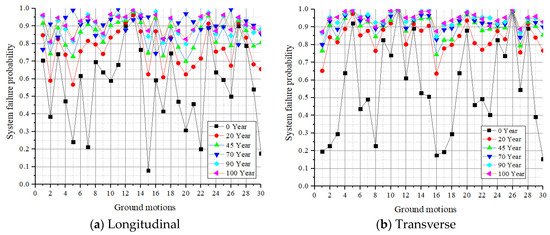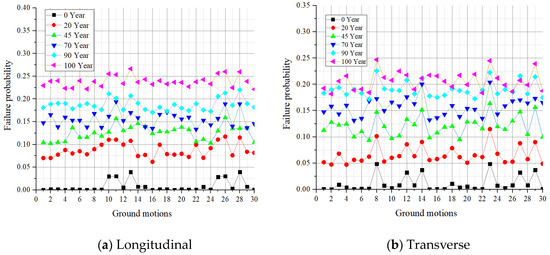 (1) In general, the failure probabilities of the three components in the longitudinal and transverse directions under different ground motions have prominent discrete characteristics, which indicates that the randomness of the ground motions has a significant influence on the failure probabilities of structural. Comparing and analyzing the failure probability of the three components at each servicing time in two directions, the failure probability of the bearings does not significantly change much with the servicing time. In contrast, the failure probability of piers and towers at the different service times increased with the servicing time. In detail, the mean values of failure probability of pier at 20 years, 45 years, 70 years, 90 years, and 100 years increased by 51.94%, 95.76%, 111.78%, 138.48%, and 156.25% in the longitudinal direction compared to the initial time, respectively. In the transverse direction, the failure probability of piers has increased by 230.85% at servicing 100 years compared to the initial time. Due to the failure possibility of the tower, the influence of the corrosive environment is also very significant.