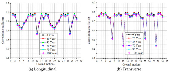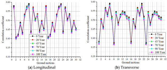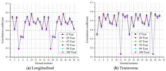 For visualization, Figure 14, Figure 15 and Figure 16 show the association coefficients of the major vulnerable parts in the longitudinal and transverse directions under the 30 ground motions. It is displayed under 30 ground-shaking excitations. The correlation coefficient divergence of the components at different service times is slight, the correlation coefficient curves almost overlap, and the average value also fluctuates around 0.50 at other service times. Furthermore, to accurately quantify and study the time-varying characteristics of the correlation coefficients, the time-varying curves of the correlation coefficient are shown in Figure 17. Whether in a longitudinal or transverse direction, the correlation coefficients of the component gradually decrease with increasing service time.