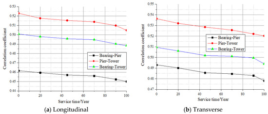 Regarding specific values, the correlation coefficient means the value of the bearing-pier in the longitudinal direction reduces to 0.4596 at 20 years of service, compared to 0.4617 at the initial service time. After 100 years of service, the average value of the correlation coefficient from 0.4617 at the initial time reduced to 0.4501, and the reduction rate was 2.52%. The average value of the association coefficient of the pier and pylon in the longitudinal direction decreased from 0.5230 at the initial time to 0.5176 at 20 years of servicing. At 100 years of servicing, the mean value of the correlation coefficient dropped to 0.5048, with a reduced rate of 3.47%. In the transverse direction, the average value of the bearing-pier correlation coefficient decreases from 0.4930 at the initial time to 0.4902 at 20 years of service. After 100 years of servicing, the mean value of the correlation coefficient decreases to 0.4781, with a reduced rate of 3.02%. The mean value of the pier-tower correlation coefficient dropped from 0.5364 at the initial time to 0.5320 at 20 years of service. After 100 years of servicing, the average value of the correlation coefficient decreases to 0.5203, with a reduced rate of 3.01%. The correlation coefficient mean value of the bearing-tower decreases from 0.5094 at the initial time to 0.5061 at 20 years of servicing. When it reaches 100 years, the average value of the correlation coefficient decreases to 0.4940, with a reduced rate of 3.03%. It is shown that the average values of the component correlation coefficients are not sensitive to changes with servicing time, whether it is longitudinal or transverse direction.
