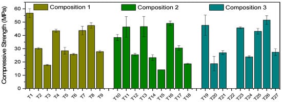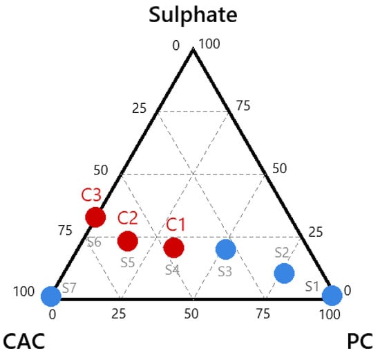 To achieve these aims, formulations of compositions C1, C2, and C3, representing typical combinations of PC-CAC-CŜ (Figure 1) as outlined by Bier and Amathieu [], were utilized. The findings of this study may provide a foundation for future investigations of ternary binders using statistical methods.