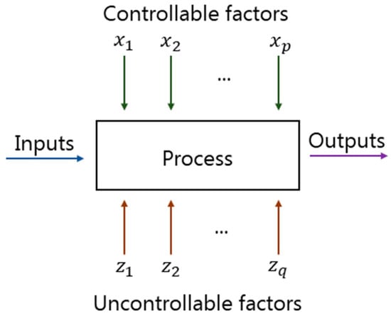 The Design of Experiments (DOE) is a statistical method used to identify the input variables that significantly influence the response of a system or process. This involves strategically planning and conducting experiments, then analyzing the data to reach substantial conclusions []. Generally, the system or process can be depicted as shown in Figure 2, including various controllable and uncontrollable factors. The controllable factors are like adjustable inputs in the process, while the uncontrollable ones can be environmental factors or certain material properties []. A comprehensive and widely used DOE method is factorial design, which tests all possible combinations of all factors across their different levels. It becomes particularly handy when considering multiple factors and their interactions []. However, for experiments with many factors, a fractional factorial design can be used to reduce the number of necessary runs, focusing on only a portion of the possible combinations, thereby saving time and resources [].