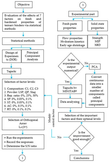 This study selected seven controllable factors at three levels (Table 4). An L27(313) orthogonal array, of 7 factors and 27 experimental runs has been chosen as an appropriate layout to determine the optimum combination of the levels of these factors (Table 5). Figure 4 provides a schematic diagram of the key steps in investigating ternary binders via the Taguchi approach. As shown, the factors and their levels were selected, the appropriate orthogonal array was chosen, and experiments were conducted in a random sequence to prevent systematic errors. Experiments on fresh and solid states were conducted, and the output results underwent statistical evaluation. The Taguchi approach was employed to analyze numerical results such as flow, cumulative heat of hydration values, compressive strength and cumulative pore volume. Furthermore, PCA was used to analyze heat of hydration curves, length change curves, MIP pore size distribution curves and XRD patterns, since the Taguchi method cannot evaluate a continuous set of data.