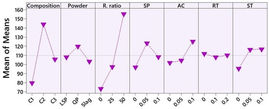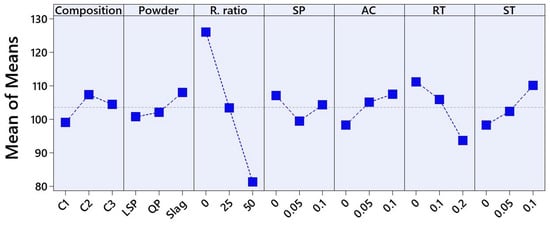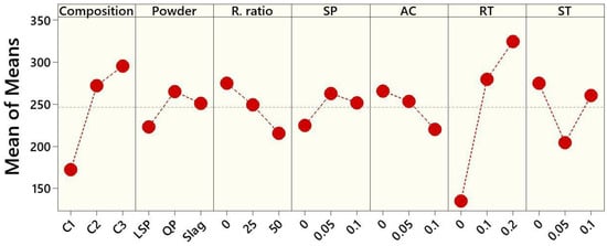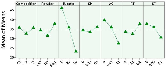 The impact of seven factors—composition, type of mineral powder, replacement ratio, superplasticizer (SP), accelerator (AC), retarder (RT) and stabilizer (ST)—on the flow properties of ternary binder pastes are depicted in Figure 5. The main effects plot, expressed as the mean of means, illustrates the influence of each factor on flow results.