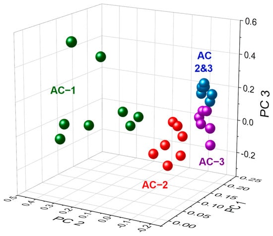 The continuous data of heat of hydration curves were further examined and analyzed using Principal Component Analysis (PCA), which converted the curves into numerical data related to the principal components, as depicted in Figure 7. Eigenvalues (Table 6) suggest that the first three principal components are significant, as their eigenvalues exceed 1. These principal components account for 69.8%, 19%, and 7.3% of the variability in the data for PC1, PC2, and PC3, respectively. Collectively, these three principal components explain 96.2% of the total variance. The 3D plot (Figure 7) represents four groups of different formulations, each sharing a common characteristic, as explained below.