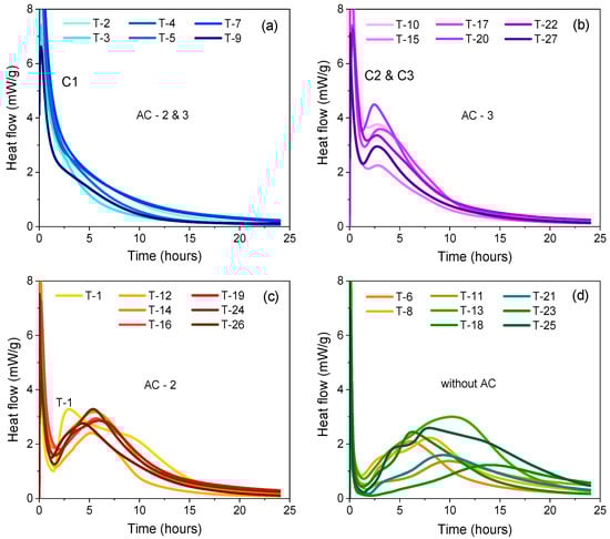The heat of hydration curves, highlighting the thermal evolution for all of the tested formulations, (a) formulations C1 with AC at levels 2 and 3; (b) formulations C2 and C3 with AC at level 3; (c) all compositions with AC at level 2; (d) all compositions without AC.