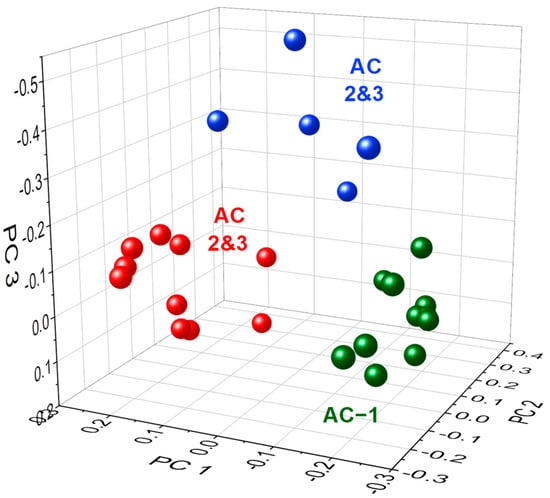The 3D scatter plot representing the three principal components derived from the length change curves of the samples.