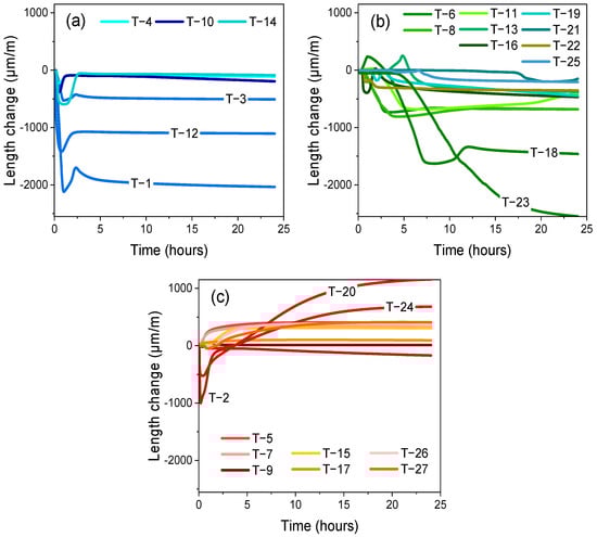 Figure 10a depicts rapid shrinkage during the initial hydration minutes, followed by minor expansion, corresponding to compositions C1 and C2. The length change pattern is consistent across all formulations, with the exception of T-1. This exception represents a pure C1 formulation devoid of powders or chemical admixtures (refer to Table 5). T-1 exhibits a higher shrinkage rate (up to 2000 μm/m), followed by a minor expansion at the end of the plastic phase. This behavior mirrors Bier and Amathieu’s system 4, to which T-1 corresponds, demonstrating similar length change behavior []. All formulations, excluding T-1, include AC at the second and third levels, potentially accounting for the observed expansion due to AC addition and ettringite formation.