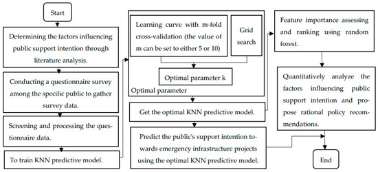 This study employed a systematic process to review the public’s support for emergency infrastructure projects and its influencing factors. Figure 1 divides the research framework into a three-stage process. Data collection and processing were conducted in Stage 1. In Stage 2, an optimized KNN prediction model was constructed to make predictions of new sample data. Stage 3 is the quantitative analysis of the influencing factors of public support. The flow of the research framework of the current study comprised the following nine steps.