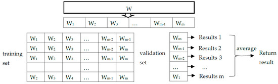 In the first step, the program was executed multiple times with all possible k values ranging from 0 to 20 to construct learning curves for the established KNN predictive model. The best value of k was then determined based on the point where the model exhibited the best performance on the learning curve. However, in practical research, the learning curves vary each time the program is executed. This suggests that the established predictive model’s generalization ability is not optimal. To address this issue and enhance the model’s generalization ability, this study employed learning curves with m-fold cross-validation due to the limited size of the dataset [34]. This process helps to mitigate the impact of variations in the learning curves and ultimately results in an optimized KNN predictive model with improved generalization ability and better suitability for real-world applications. The principle of m-fold cross-validation is shown in Figure 2.
