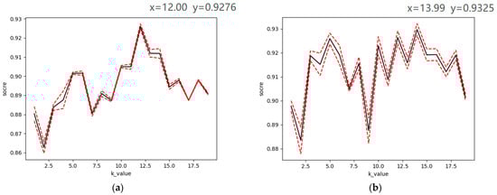 Using the above methods, we retrained the existing KNN predictive model. Finally, the average classification accuracy of the m models was computed as the model’s final classification accuracy. The value of m can be set to either 5 or 10 [35]. Different values of m result in different means and variances, which correspond to different average effects and stability of classifiers, consequently affecting various metrics of the KNN model. Such dataset partitioning allows all samples in the dataset to serve in both the training set and the validation set, which significantly enhances the model’s generalization ability, resulting in an optimized KNN predictive model. Meanwhile, the best value of the nearest neighbor parameter k was determined by selecting the parameter value that corresponded to the optimized performance point on the learning curve. The results of the learning curves with m-fold cross-validation are shown in Figure 3. The horizontal axis represents the nearest neighbor parameter k with values ranging from 0 to 20, while the vertical axis represents the mean, reflecting the average effect of the KNN model. According to Figure 3a, the KNN model performs best when k is set to 12, achieving an average effect of 92.76%. According to Figure 3b, the KNN model performs best when k is set to 14, with an average effect of 93.25%.