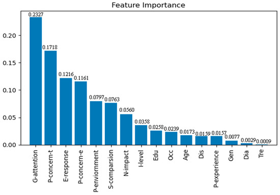 In Figure 4, the horizontal axis represents the 16 features influencing the public’s support, while the vertical axis represents the importance of each feature, arranged in descending order of importance. From Figure 4, it can be seen that government attention, public concern, and emotional response have the most substantial impact on public support, with their importance all exceeding 10%. In particular, government attention was the most significant influence, with an importance of 23.27%. Following closely behind were psychological distance and social comparison, both with importance values exceeding 5%. Finally, the impact of features like interaction level, background information, and prior experience on public support was relatively minor, with their importance all being less than 5%. Among the factors, knowing someone diagnosed with COVID-19 and knowing someone receiving treatment at Leishenshan Hospital had the least impact, with their importance being less than 0.3% (specifically 0.29% and 0.09%, respectively).