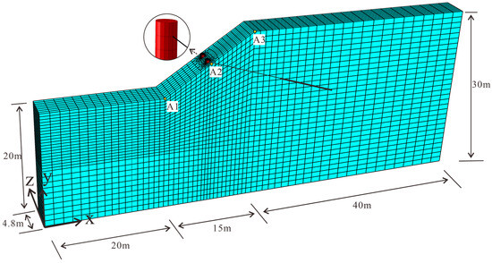 For this study, we selected the simplified three-dimensional slope model proposed by Cai and Ugai [33] (Figure 1), which is widely employed for numerical analyses and validations [33,34,44,45]. In the model, two cylindrical concrete piles, each with a length of 15.5 m, are placed at the midpoint of the slope. The diameter of each pile (D) is 0.8 m. According to Won et al. [34], the spacing S between the pile centers is 2.4 m, which is three times the pile diameter (S = 3D). Two anchors, each with a free section of 12 m and an anchoring section of 8 m, are placed in the slope with an inclination angle of 15° to the horizontal line. The anchor head is located 0.5 m below the top of the pile. Tie constraints in the ABAQUS software are used to define the connection between the anchor and the pile, so that the anchor head and the pile have the same degree of freedom at the tied nodes. The parameter settings in the model are listed in Table 1, which are based on previous studies [33,46,47]. In the simulations, the piles and anchors were modeled as linear elastic materials, while the soil was modeled by the Mohr–Coulomb failure criterion. Three monitoring points, namely A1, A2, and A3, were set in the model to measure the acceleration and displacement of the slope under seismic loading (Figure 1).